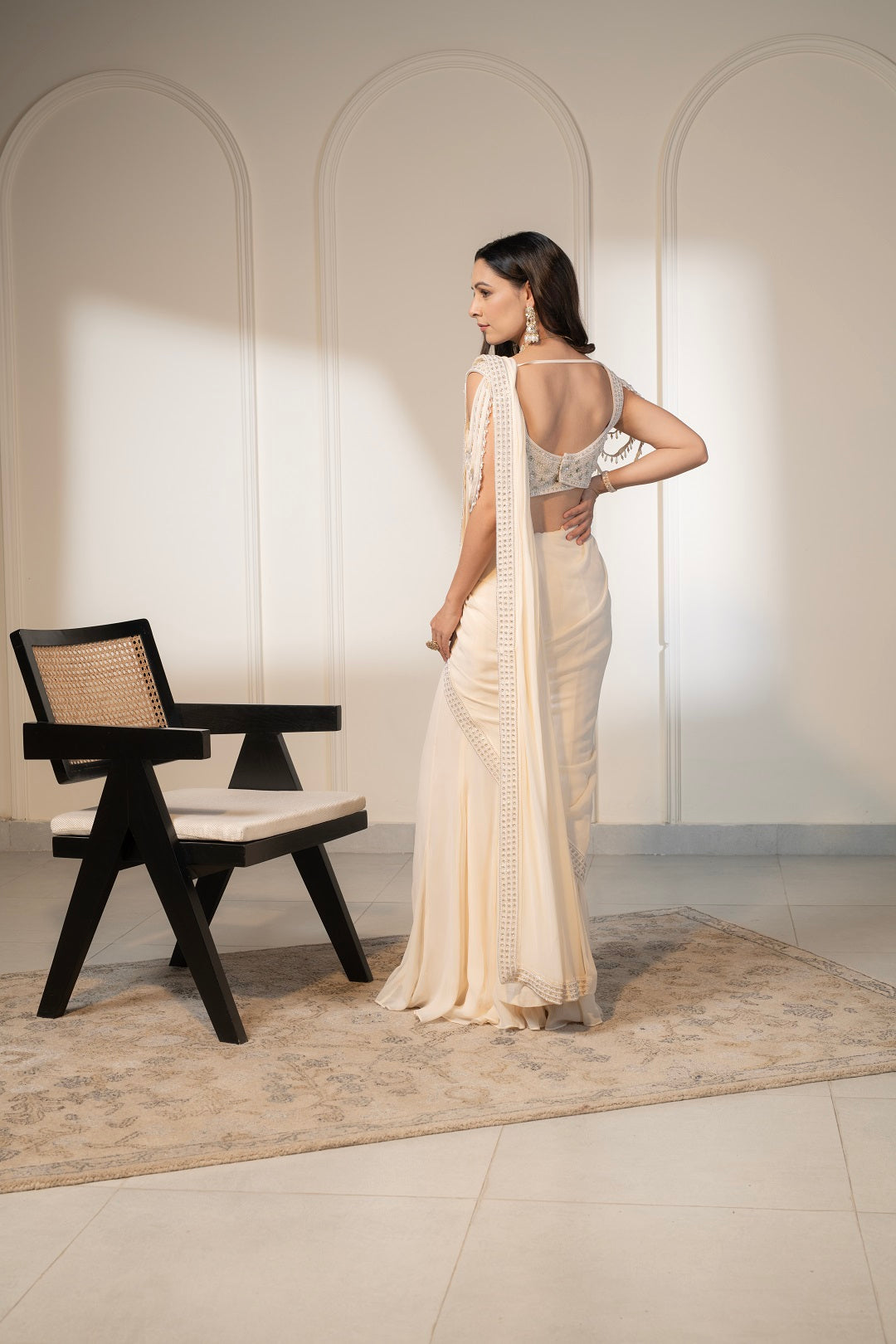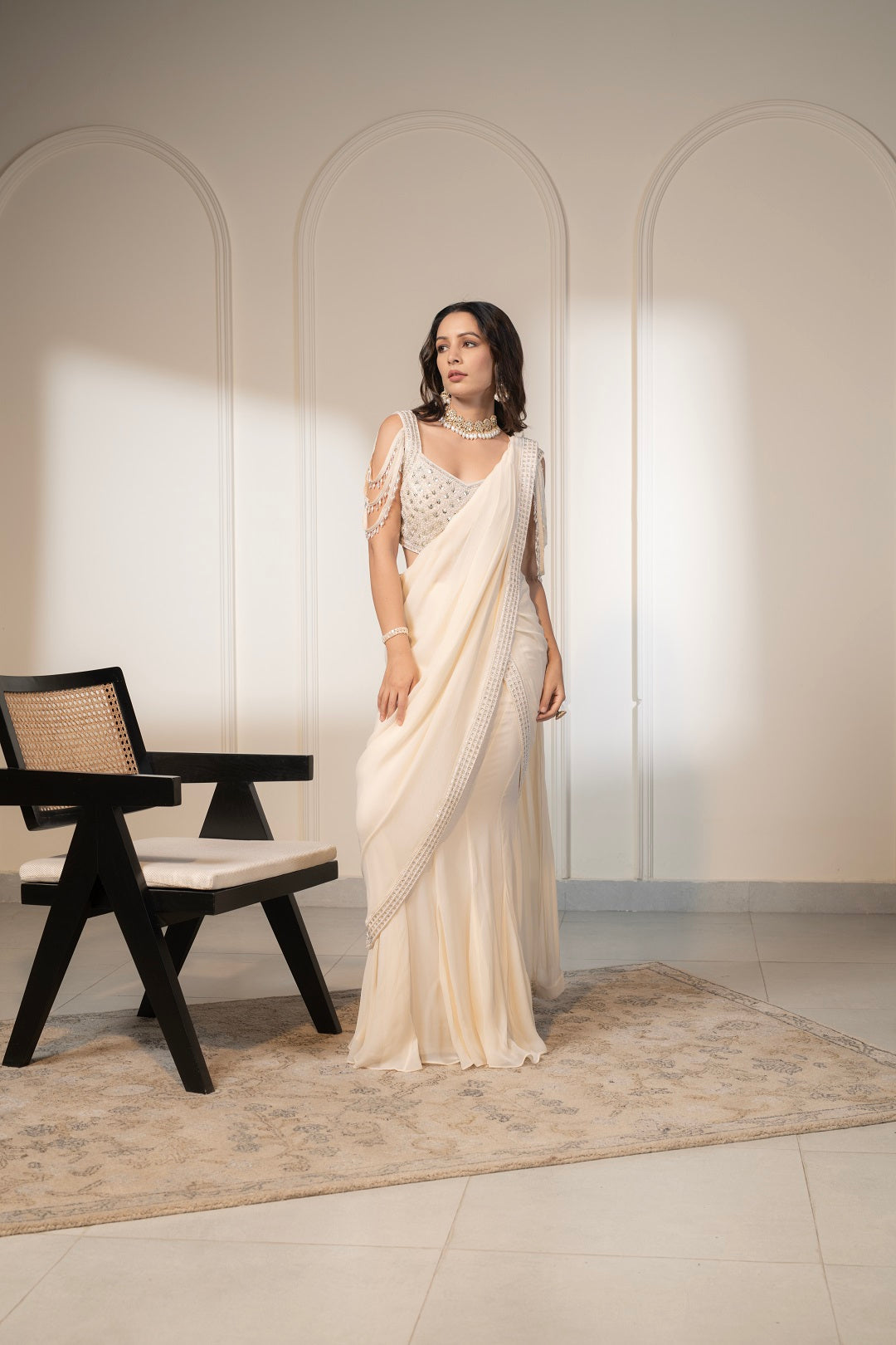 Ivory saree hand embroidered using crystals, mirrors and sequin
