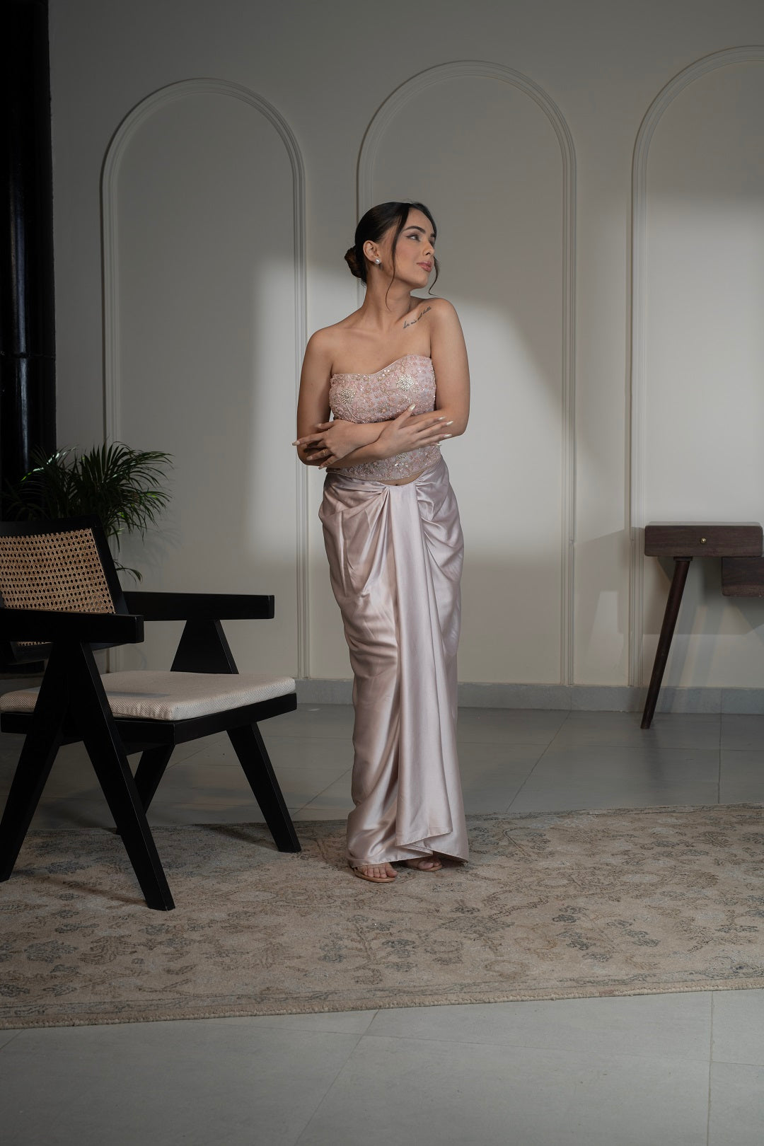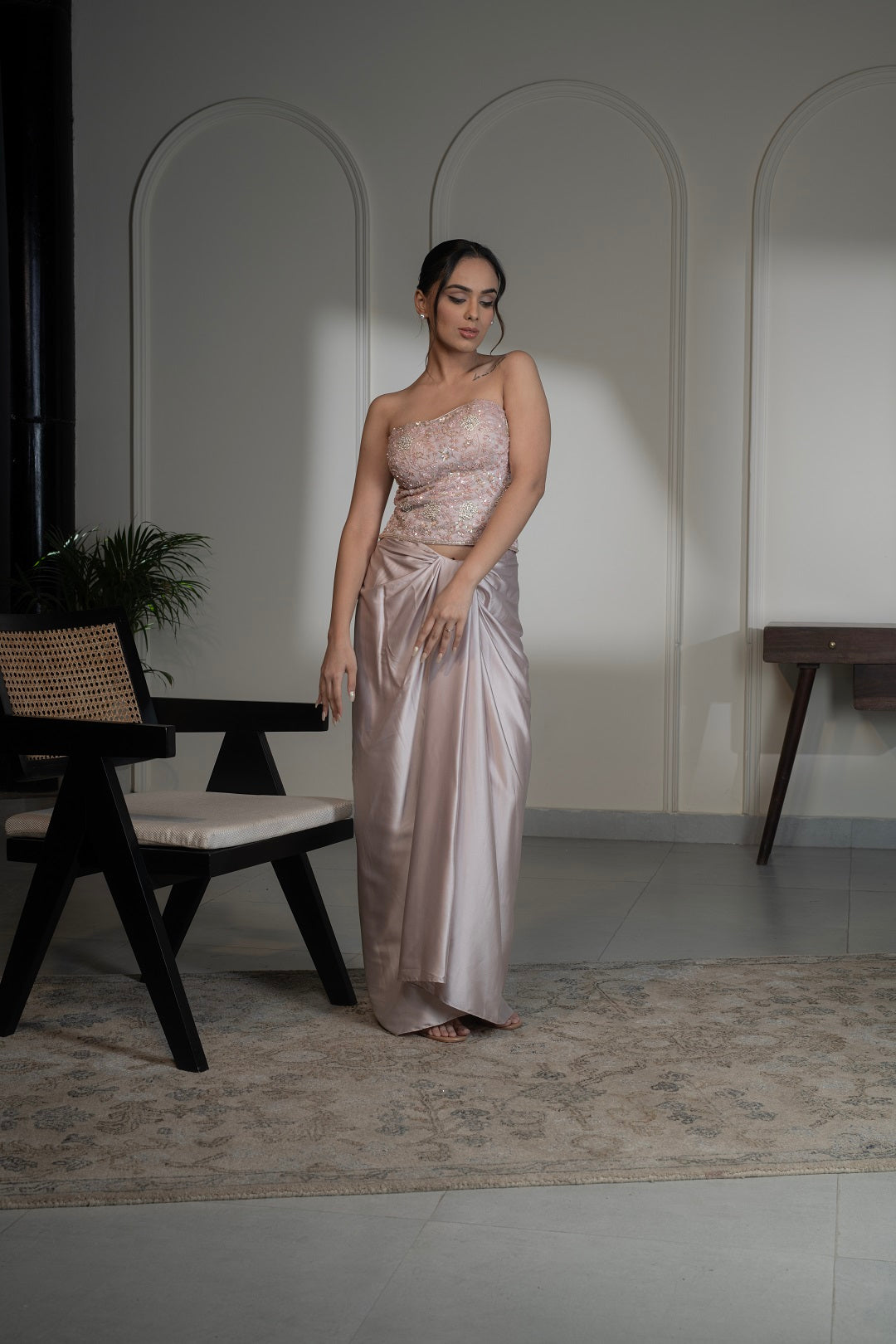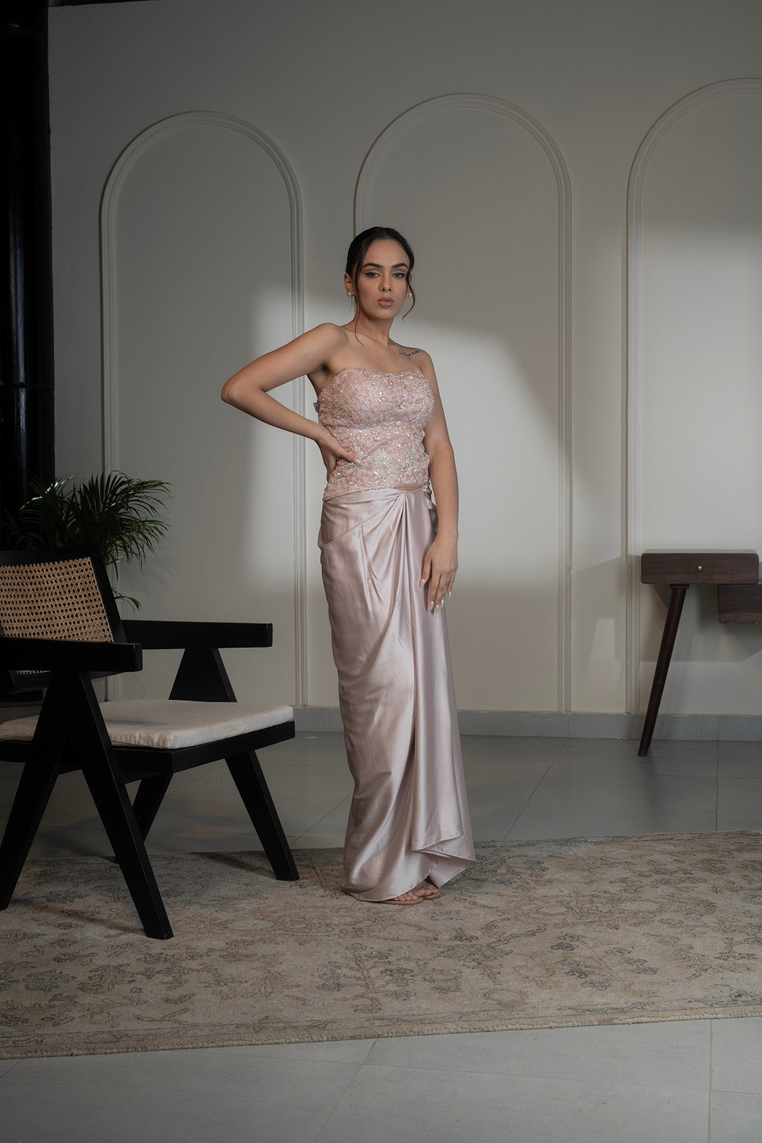 Embellished corset paired with draped skirt