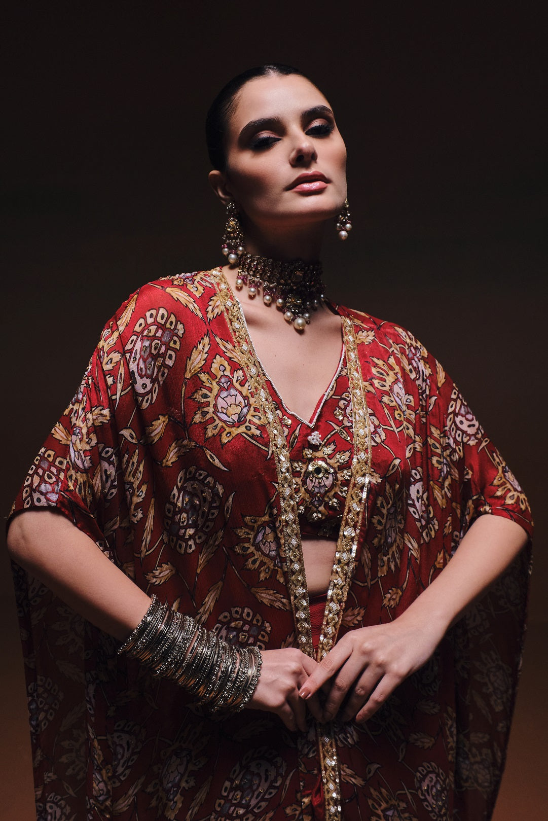 Red printed cape set with printed embellished blouse and draped skirt