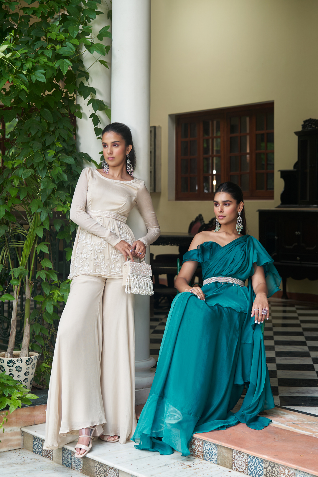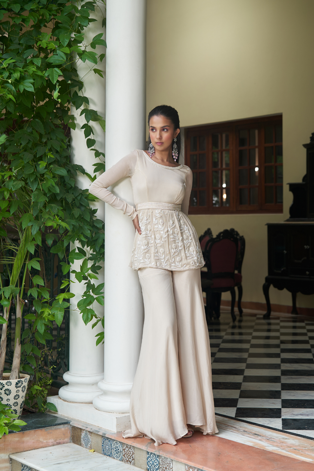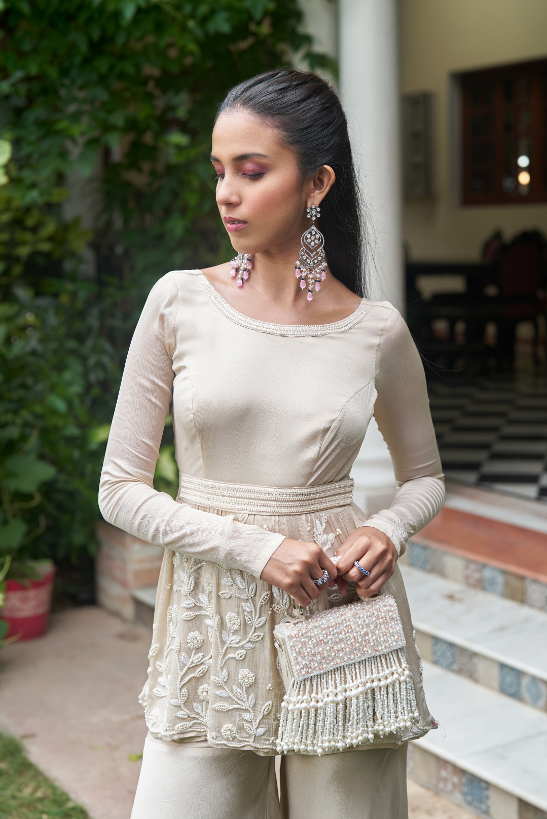 Ivory peplum top embellished with pearls, sequins and cutdana paired with hand embroidered belt